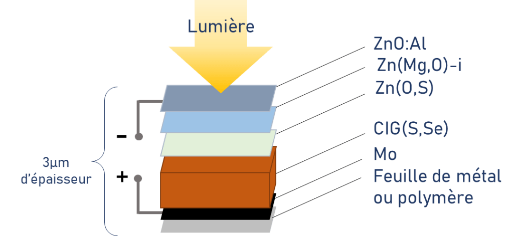 Parmi les cellules qui exploitent commercialement la technologie de couches minces, les cellules en CIGS (alliage semi-conducteur à base de cuivre, indium, gallium, sélénium et soufre de formule Cu(In, Ga)(S, Se)2), sont celles qui présentent les rendements de conversion photovoltaïque les plus élevés, comparables aux cellules silicium : jusqu’à 23,4 % lorsque le CIGS est déposé sur verre, entre 20 et 22% lorsqu’il est déposé sur des substrats flexibles et légers (feuillards métalliques, polymères).